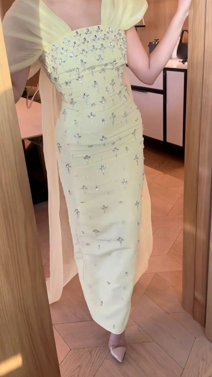 Classy Yellow Satin Chiffon Beaded Long Birthday Prom Gown Evening Dress SP1199