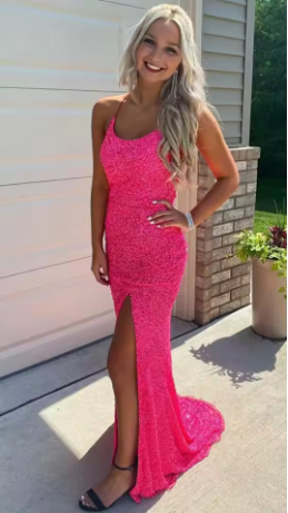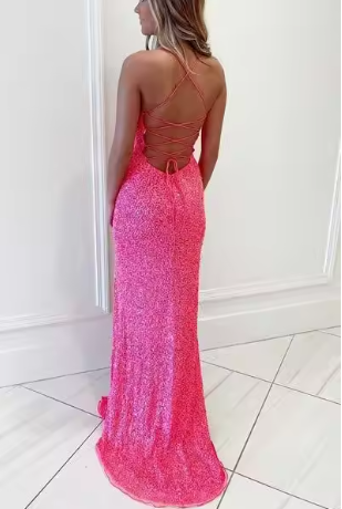 Cute Sheath Scoop Neck Straps Orange Sequins Prom Dresses with Slit Y1400