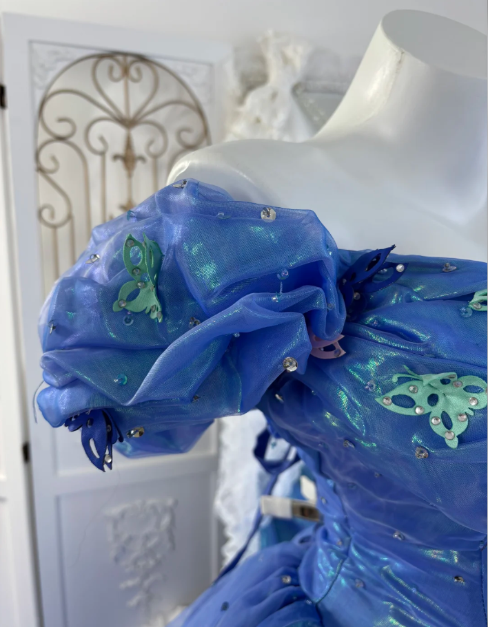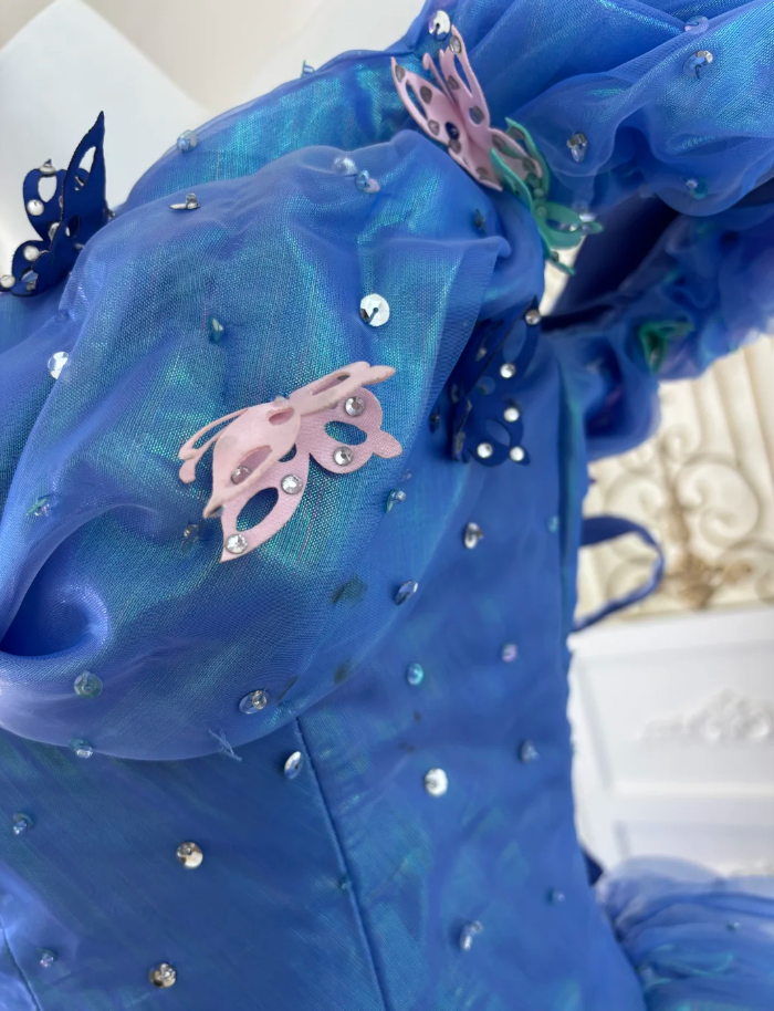 Cute V Neck Blue Tulle Beaded Ball Gown Off The Shoulder Princess Quinceanera Dress SP1445