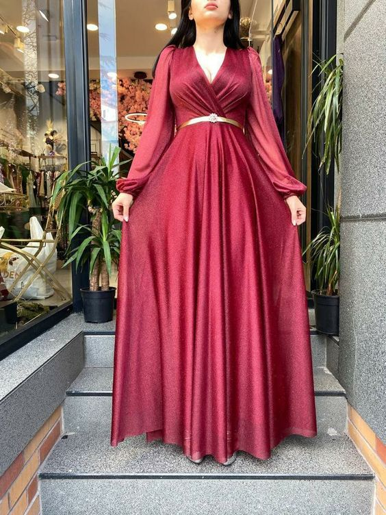 Elegant A-Line V Neck Long Sleeves Prom Dresses Y5785