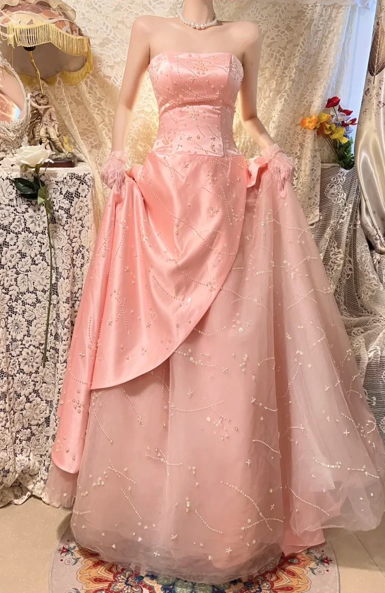 Elegant Pink Strapless Satin Tulle Beaded Long Party Dress Prom Dresses SP407