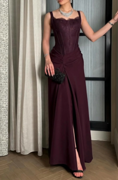 Elegant Spaghetti Straps Burgundy Lace Satin Slit Mermaid Long Party Dress Birthday Prom Dresses SP1224