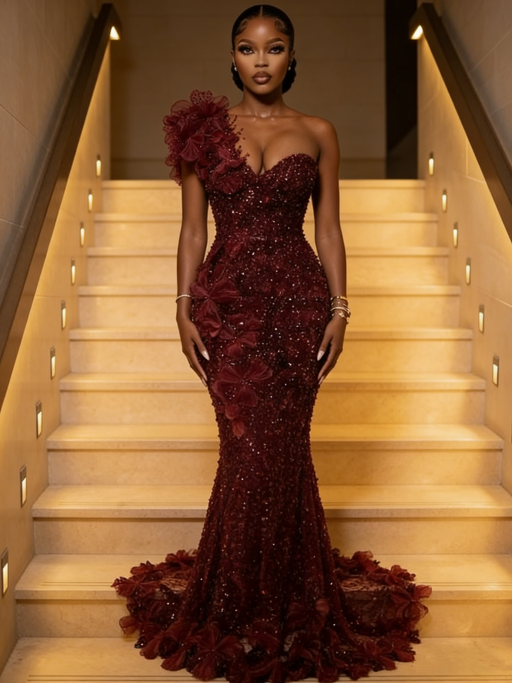 Luxurious Burgundy One Shoulder Sequin Tulle Beaded Mermaid Long Party Dress Formal Birthday Prom Dress SP1367