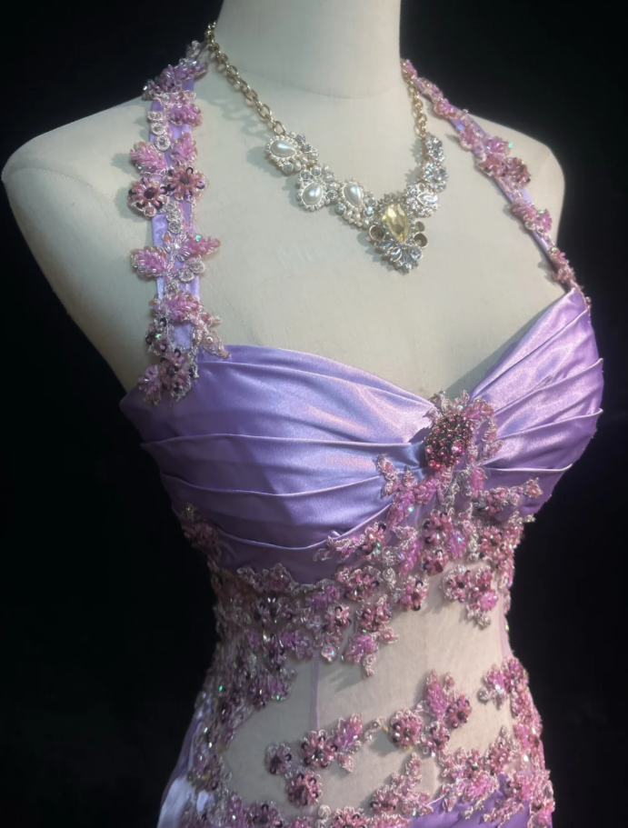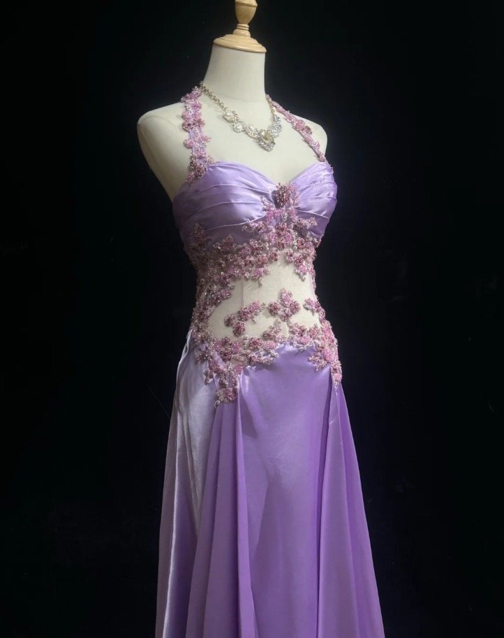 Pretty Halter Lavender Satin Beaded Mermaid Long Prom Dress Evening Dress SP1382