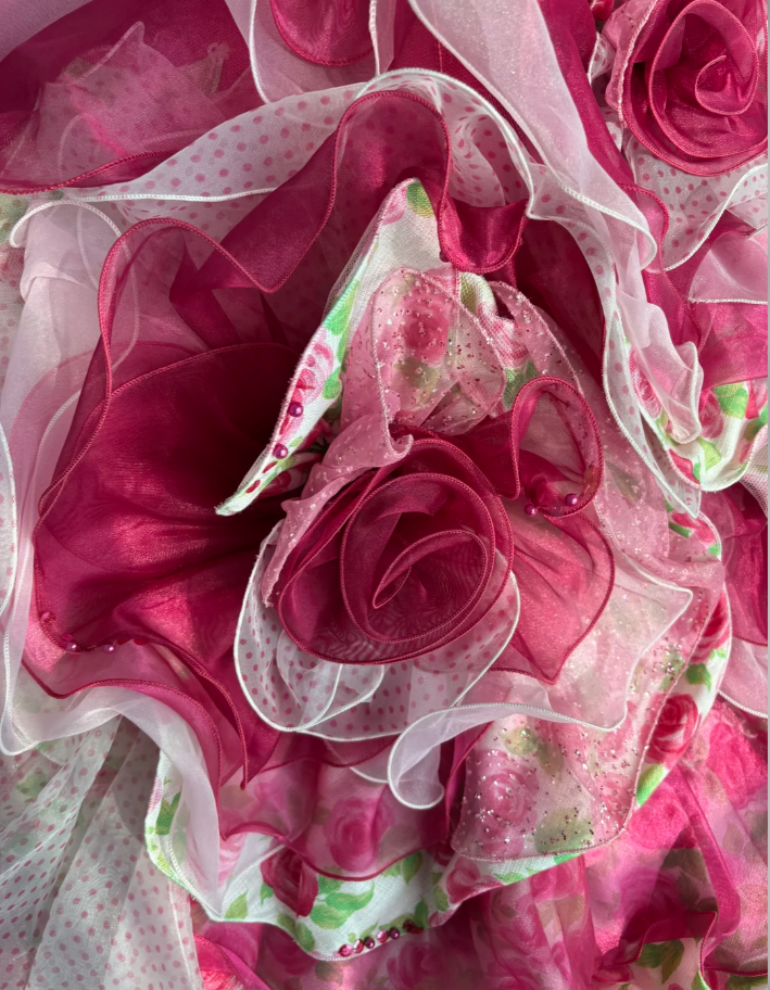 Pretty Strapless Rose Pink Satin Floral Beaded Tulle Layered Ball Gown Sweet Quinceanera Dress With Beaded SP1454