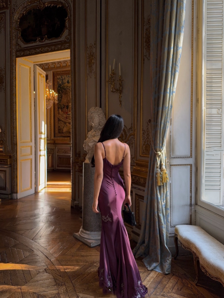 Vintage Purple Spaghetti Straps V Neck Satin Beaded Appliques Mermaid Evening Dress Long Prom Dress SP841