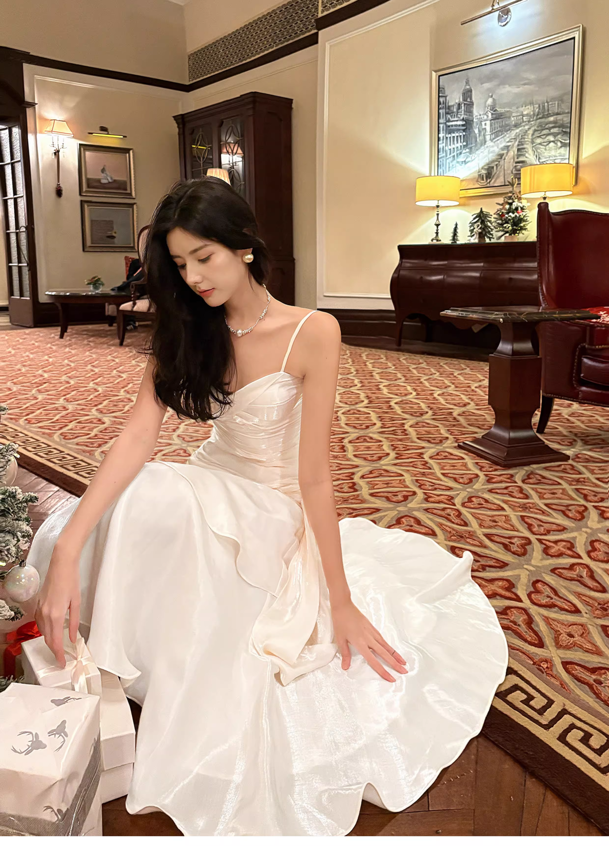 Charming White Spaghetti Strap Satin Ruffles Layered Mermaid Long Party Dress Prom Dress SP1985
