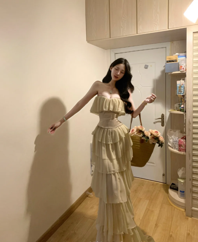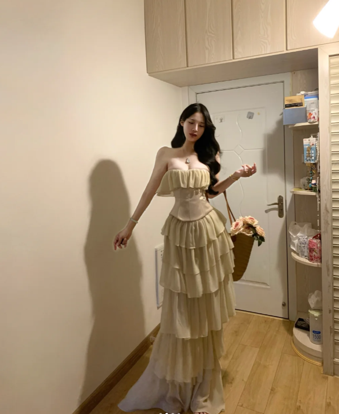 Classy Strapless Apricot Chiffon Layered Long Prom Gown Formal Guest Dress SP286