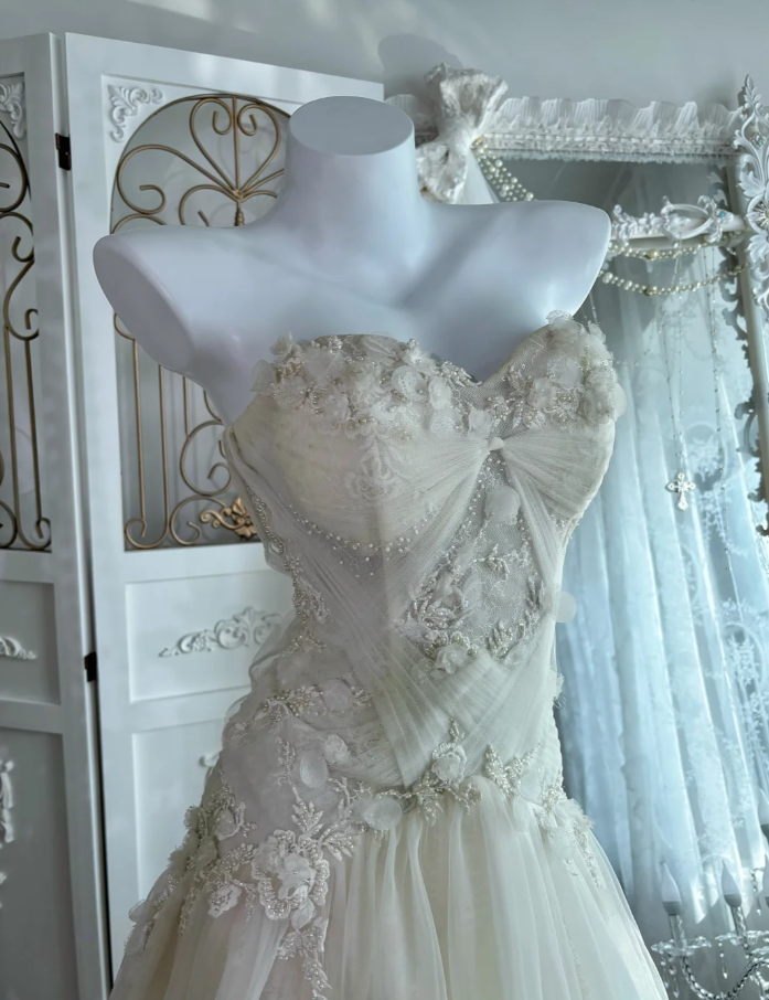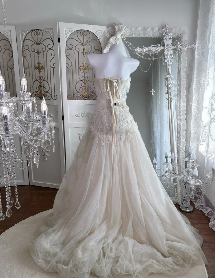 Classy Strapless Off White Tulle Beaded Appliques Mermaid Long Birthday Party Dress Prom Gown SP1463