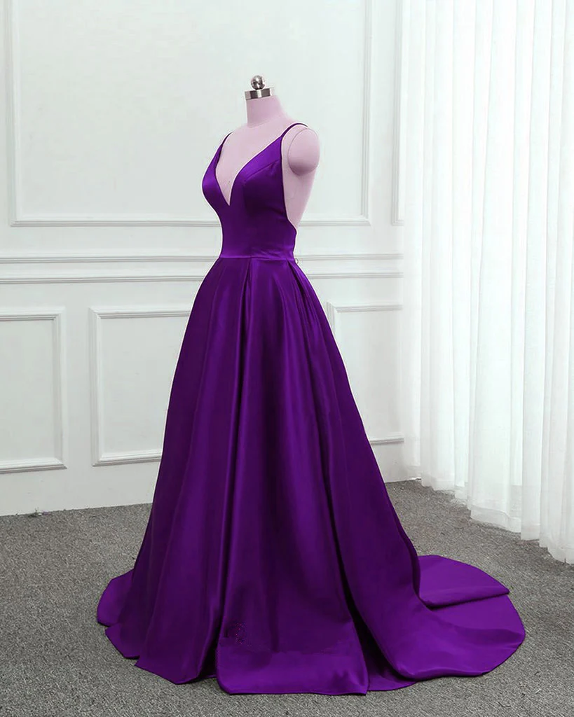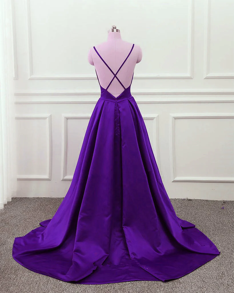 Dark Purple Satin Cross Back Straps V-Neckline Party Dress, New Prom Dress Y1049