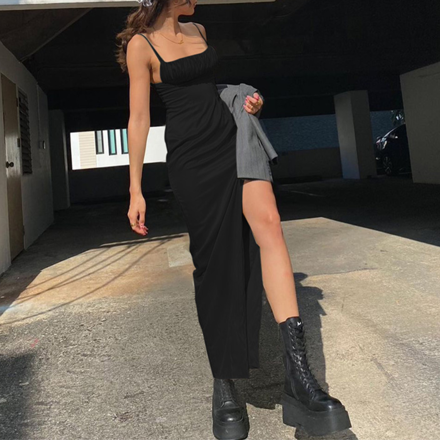 Elegant Black Spaghetti Straps Long Prom Dress With Split,Sexy Prom Gown Y1321
