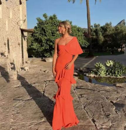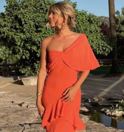 Elegant Coral Orange One Shoulder Peplum Prom Dress with Ruffle Hem Y6249