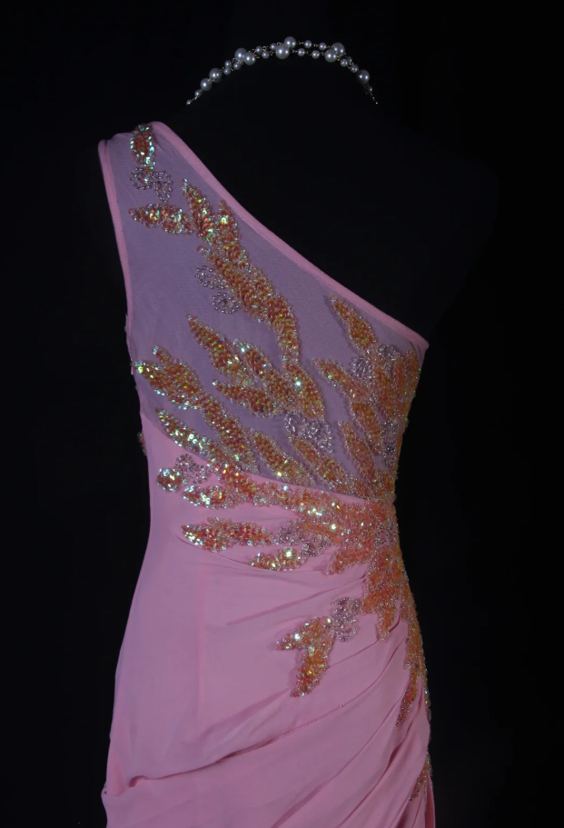 Elegant Pink One Shoulder Chiffon Sequin Beaded Mermaid Evening Dress Slit Long Birthday Prom Dress SP1692