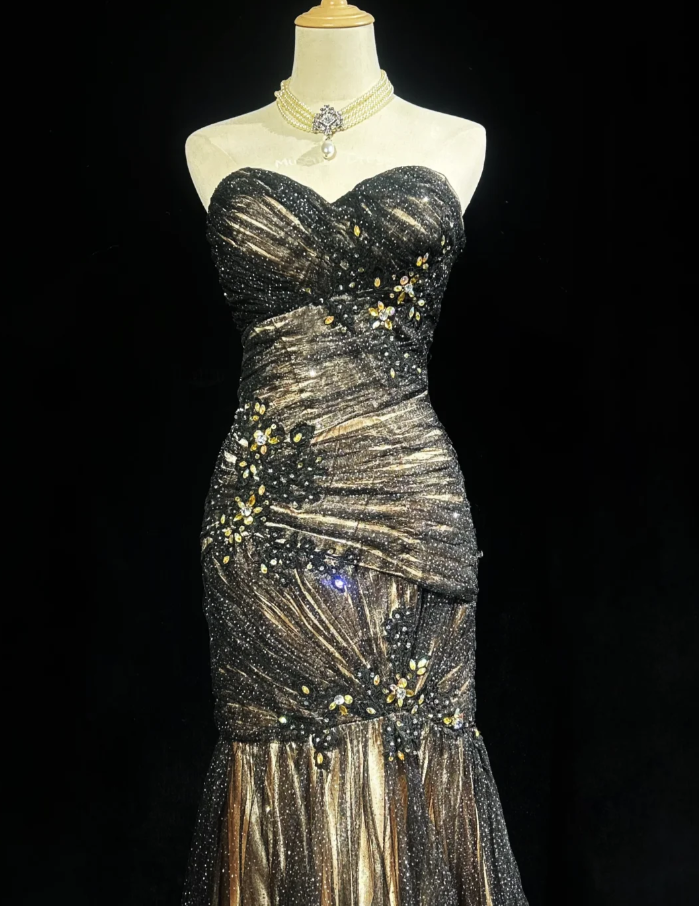 Glitter Strapless Tulle Appliques Beaded Mermaid Long Evening Dress Birthday Prom Dresses SP1791