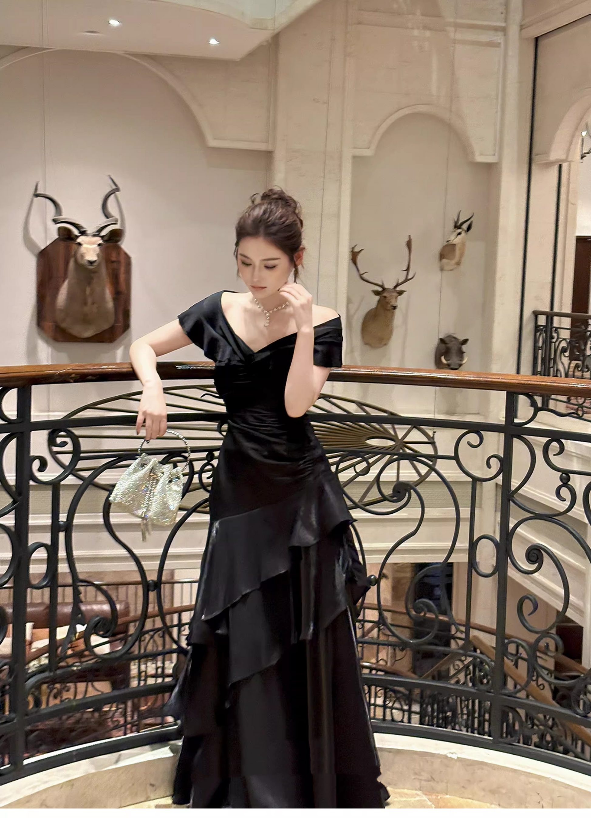 Gorgeous Off The Shoulder Satin Ruffles Layered Mermaid Long Party Dress Black Wedding Guest Dress SP1977