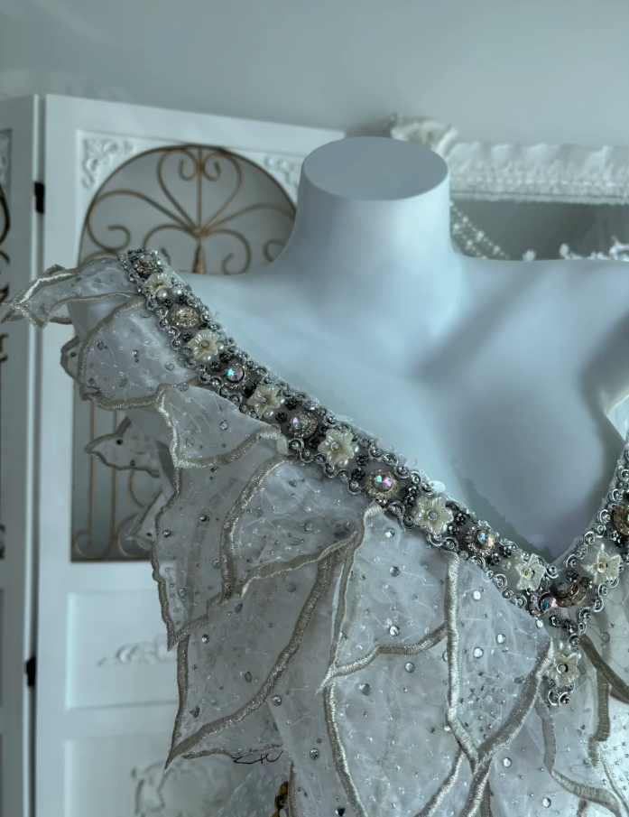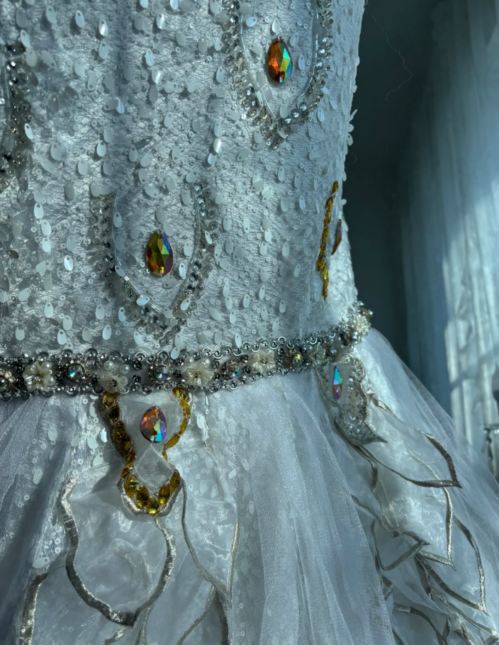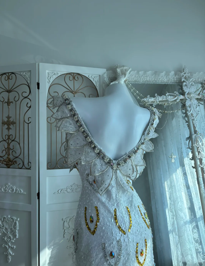 Luxurious White V Neck Tulle Sequin Beaded Mermaid Long Party Dress Prom Gown SP1452