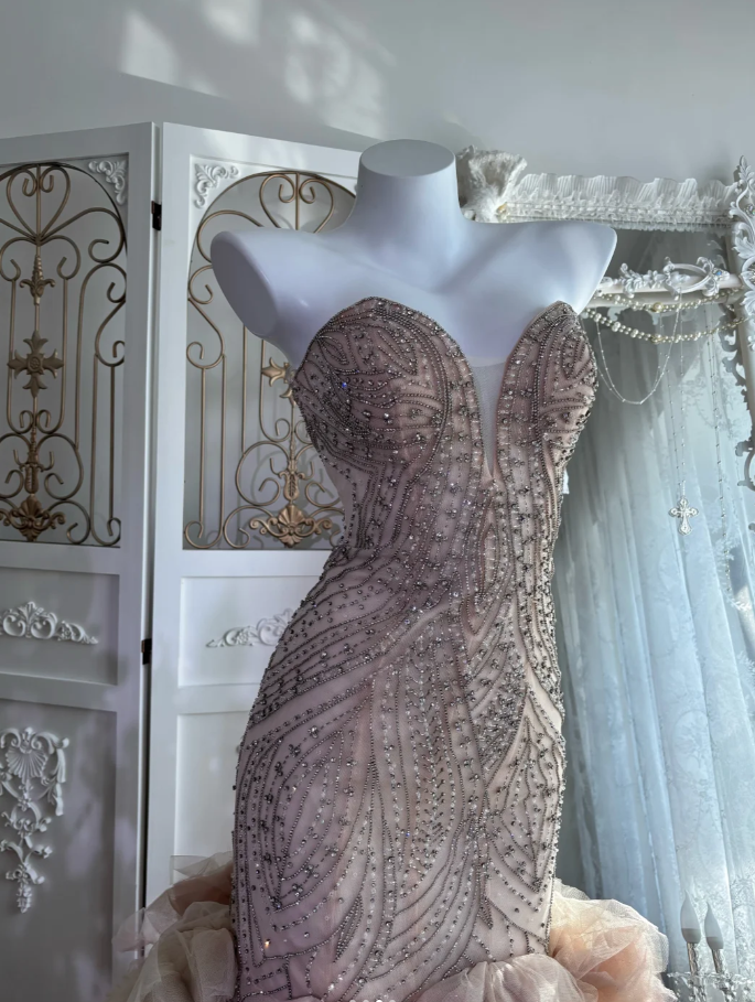 Pretty Sweetheart Neck Nude Pink Tulle Beaded Mermaid Long Party Dress Formal Wedding Guest Dress SP1459