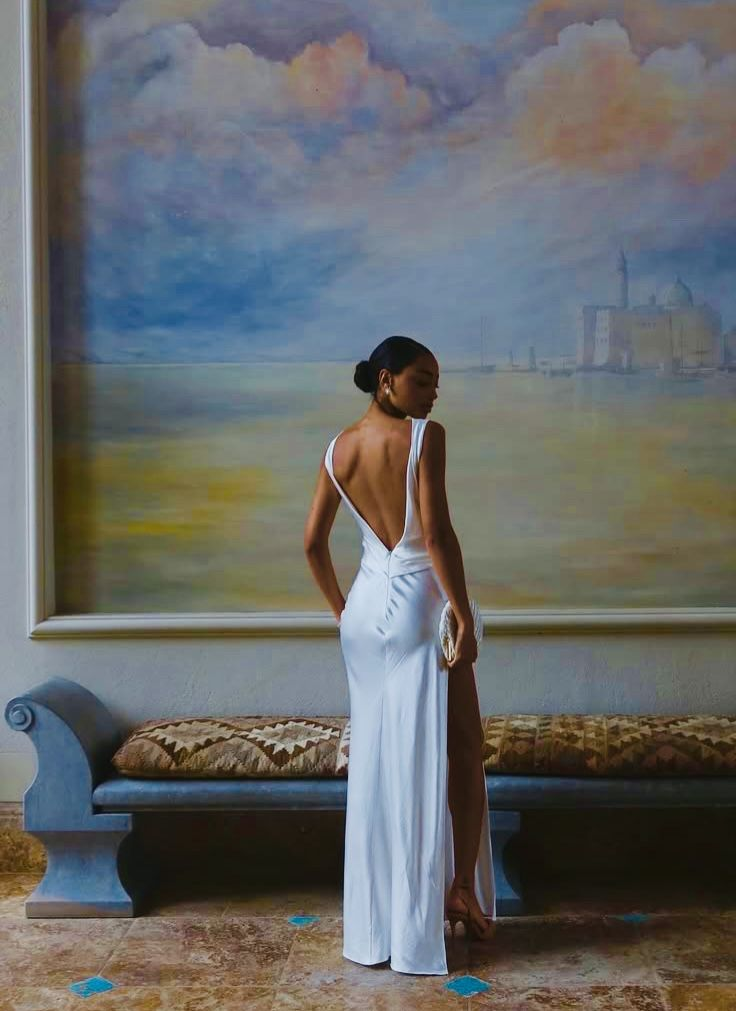 Stylish Sleeveless Satin High Slit Long Wedding Guest Dress White Backless Evening Dress SP1062