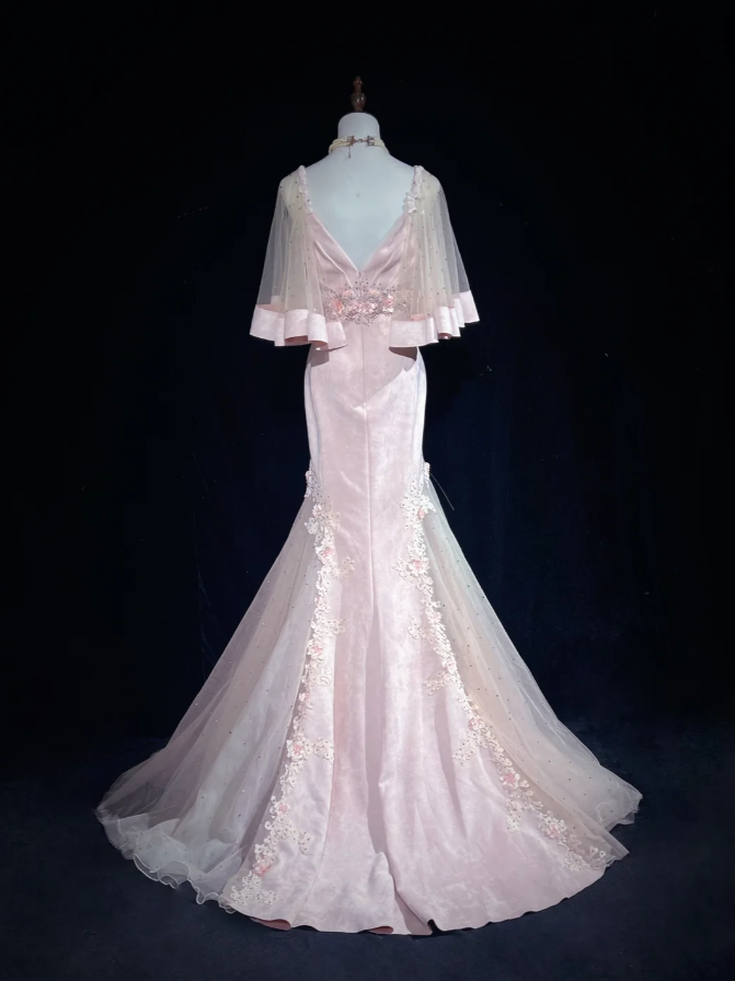 Sweet Pink V Neck Appliques Mermaid Long Birthday Party Dress Prom Dresses SP1285