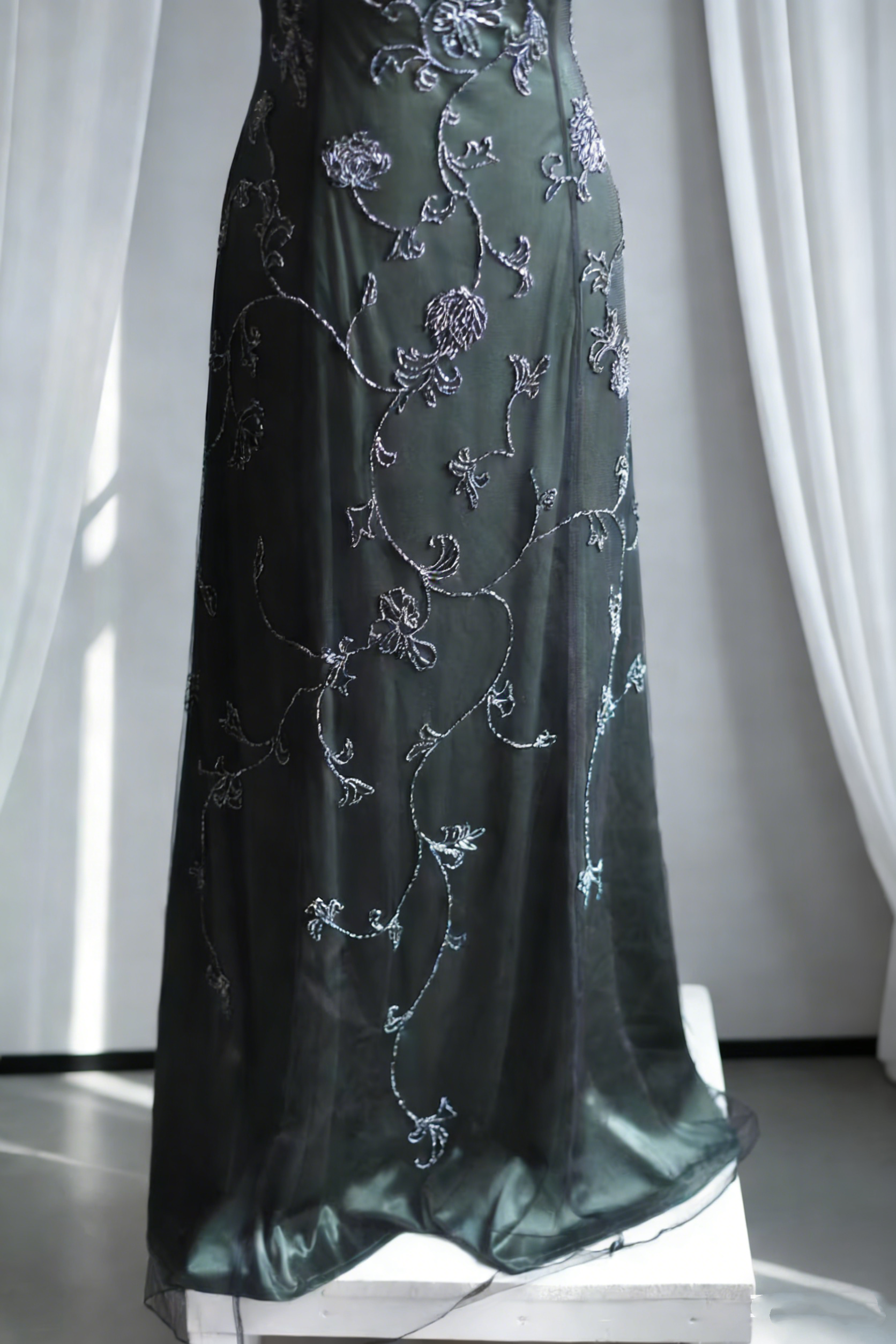 Unique Green Spaghetti Straps Satin Tulle Beaded Mermaid Long Evening Dress Birthday Outfits SP1810