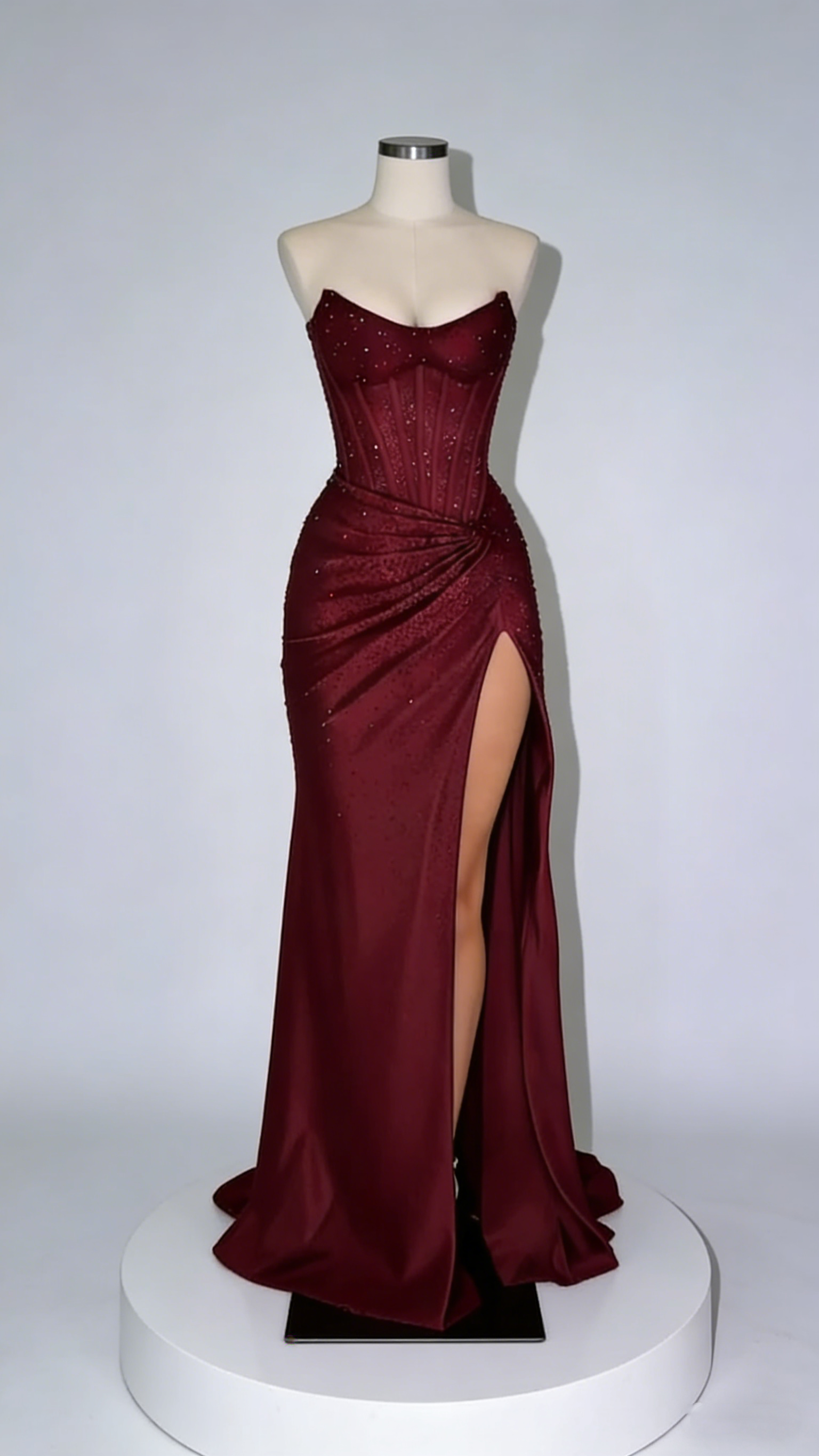 Vintage Burgundy Strapless Satin Beaded Mermaid Slit Evening Dress Long Prom Gown SP1897